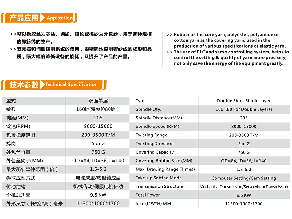 應(yīng)用:整以橡膠絲為芯絲,滌綸、錦綸或棉紗為外包紗,用于各種規(guī)格的橡筋線的生產(chǎn)。變頻器和伺服控制系統(tǒng)的使用,更精確地控制著紗線的成形和品質(zhì),既大幅度降低設(shè)備的能耗,又提升了產(chǎn)品的產(chǎn)量。